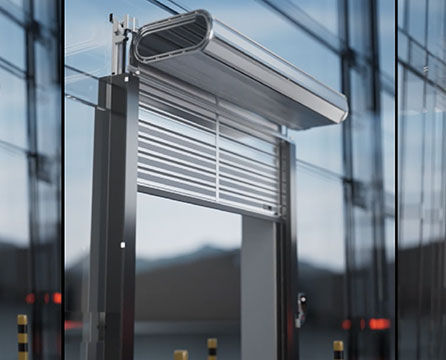 These 90° spiral doors follow a spiral path guided by specialized rails, allowing for faster opening and closing speeds. The spiral mechanism is at the end of the horizontal includes a 90-degree turn, which gives the option of top and front opening in a single operation. This design optimizes space and allows for a more compact roll-up mechanism.